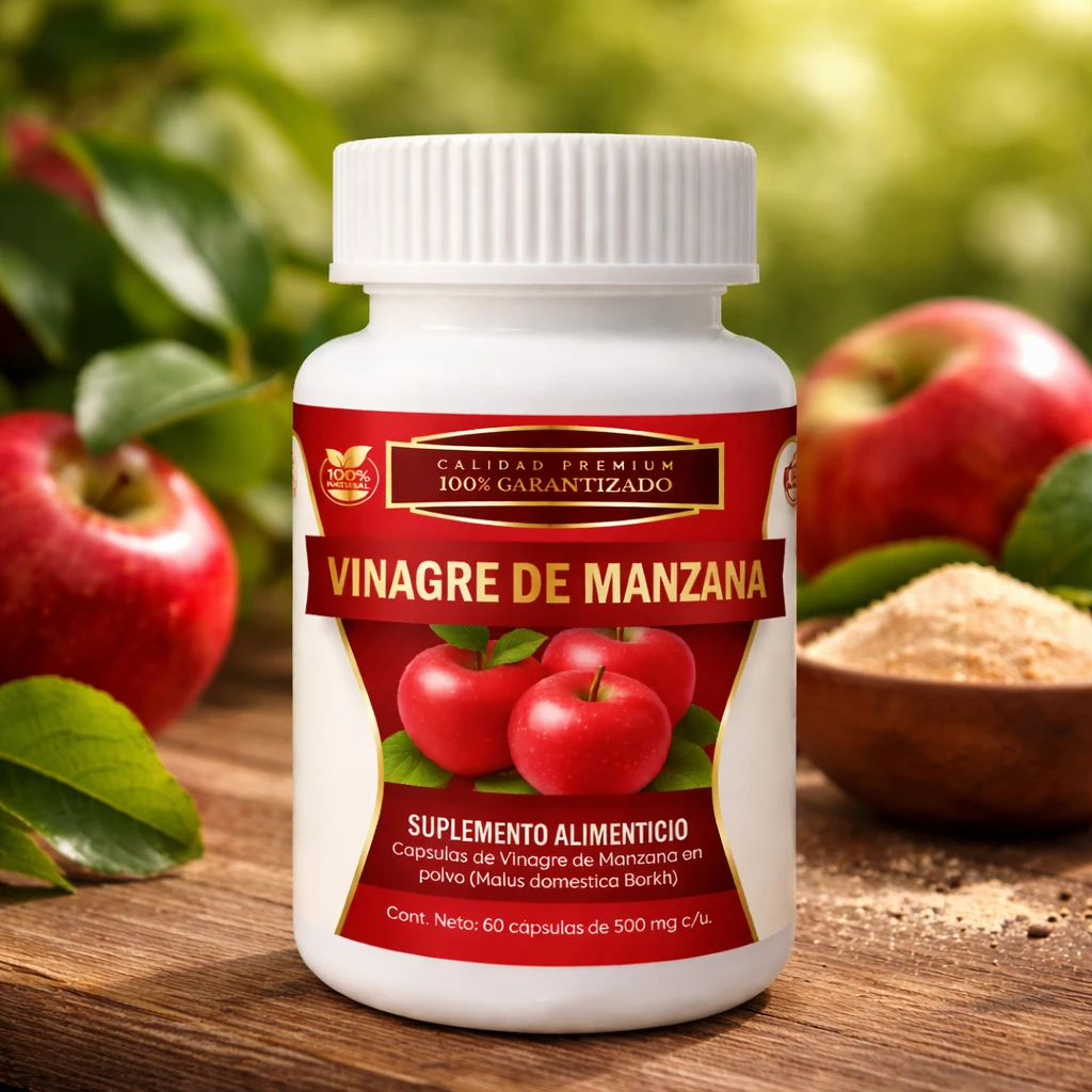 Frasco con 60 cápsulas de 500 mg cada una (contenido 100% Vinagre de manzana puro en polvo, Calidad Premium).